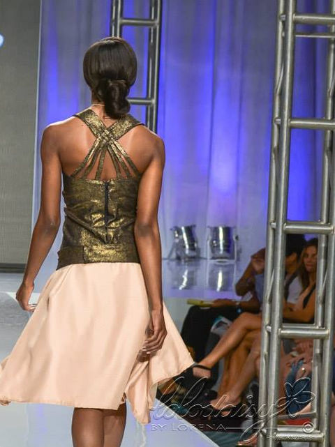 This Spring 2014 collection was presented at Tampa Bay Fashion Week in September of 2013. The gold ornament was inspired by the idea of making fashion the frame for women who are inherently as beautiful as works of art.